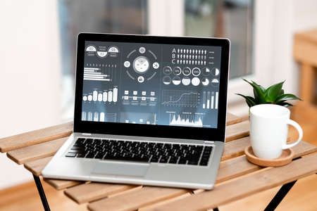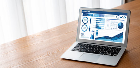 Financial data analysis dashboard by Fintech BI or business intelligence display on laptop screen to in-depth financial data analysis by business people working on business marketing. Habiliment