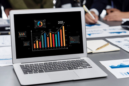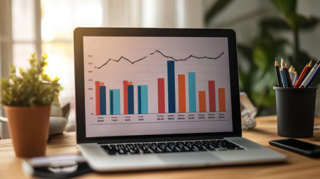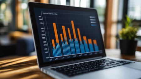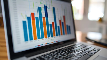 Modern laptop displaying a vibrant data visualization chart with colorful bars in a bright workspace. Ideal for business and finance representation.