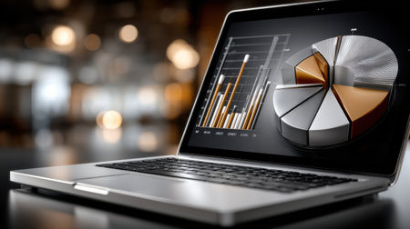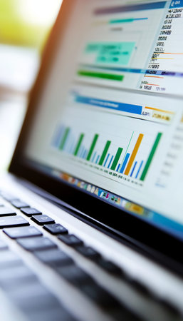 Close-up view of a laptop displaying data analysis with charts and graphs, perfect for showcasing technology, finance, or business analytics themes.