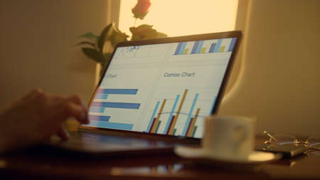 Business analyst working laptop on corporate trip. Hands touch computer closeup. Unrecognized businesswoman analyzing charts at computer screen. Successful ceo manager traveling private luxury jet.