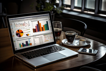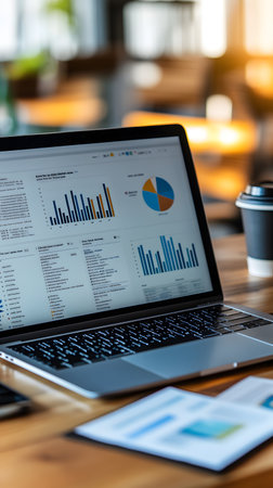 Laptop displaying financial data and charts on a desk with a cup of coffee, showcasing business analytics and reporting