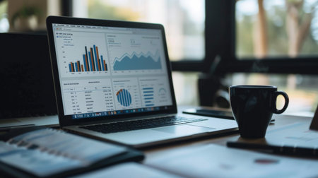 An office desk with a laptop displaying various business graphs and charts, surrounded by documents and coffee.