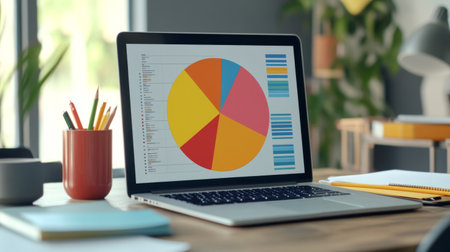 A vibrant 3D pie chart displayed on a sleek laptop screen, showing market share distribution with colorful segments. The workspace includes notebooks and a coffee cup, emphasizing productivity