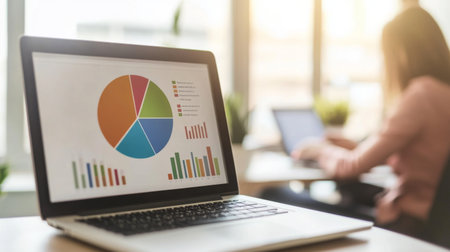 A colorful pie chart displayed on a laptop screen in a modern office setting, with a business professional analyzing data in the background.