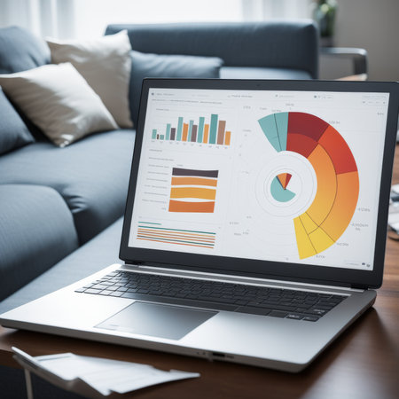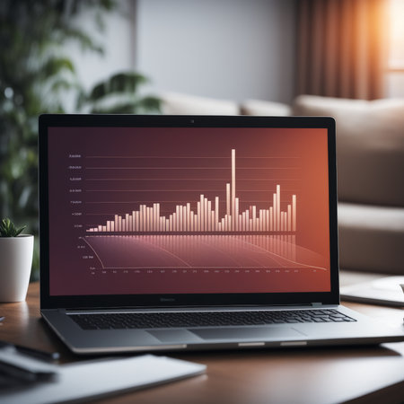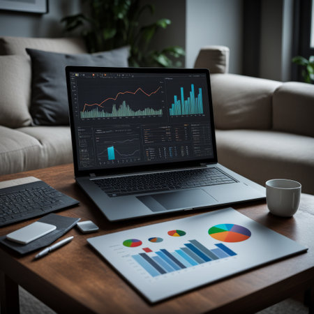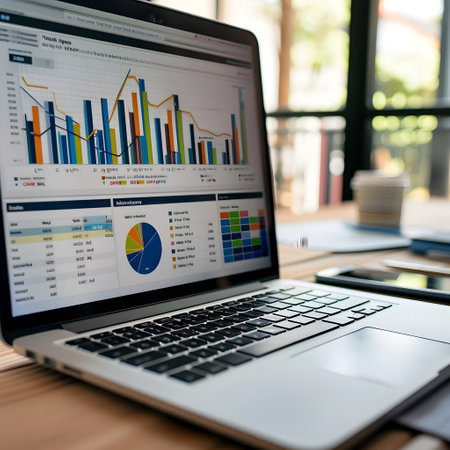 A financial analyst performs data analysis on a laptop, reviewing colorful graphs and charts. A vibrant workspace setting enhances the focus on critical statistics and insights.