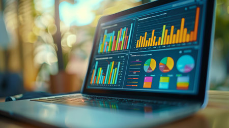 A laptop displaying colorful graphs and charts, representing data analysis and business insights in a modern workspace.
