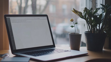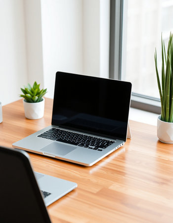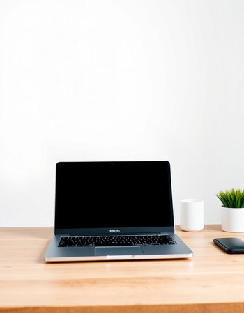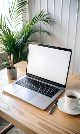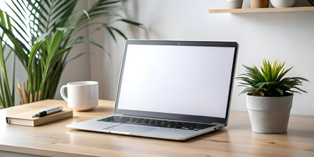 A clean and modern workspace with a laptop. a cup of coffee. and a potted plant. The laptop's screen is blank. perfect for adding your own text or image. This photo is ideal for showcasing productivity. creativity. and a minimalist lifestyle.