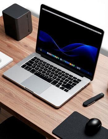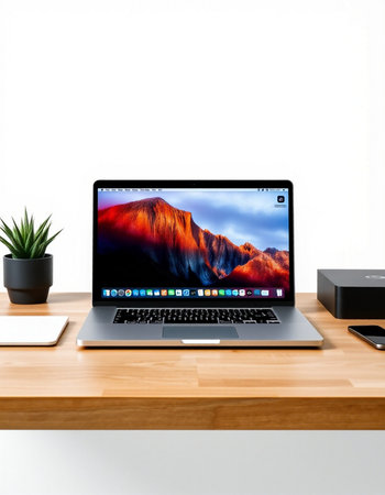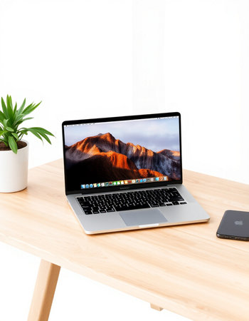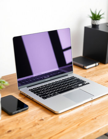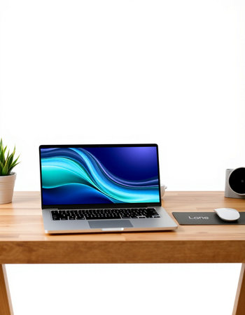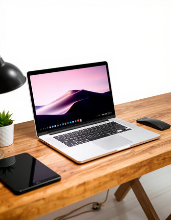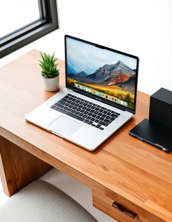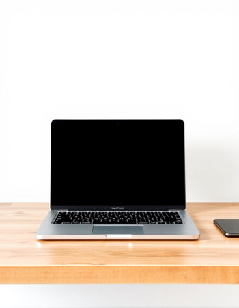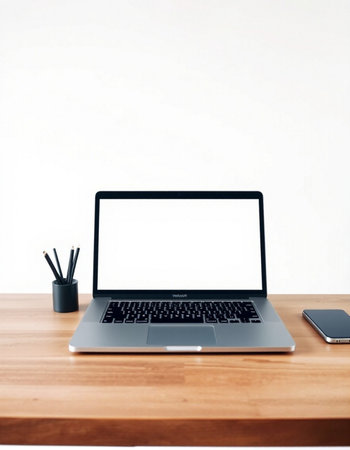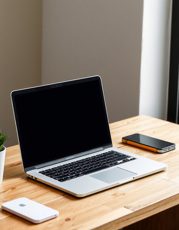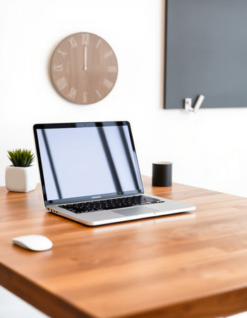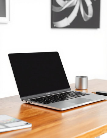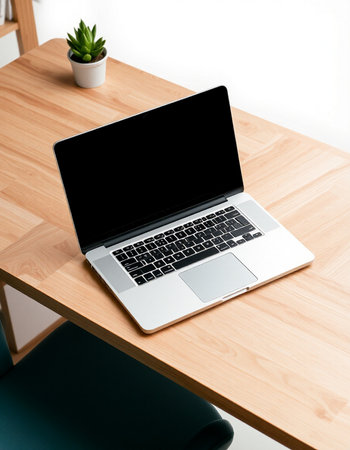 Clean and modern mockup of a MacBook Air on a wooden desk with blank screen. perfect for showcasing website designs. apps. or presentations.