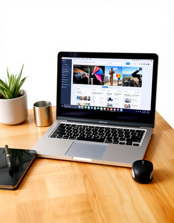 A stylish laptop displaying a digital portfolio showcasing a variety of creative content. Ideal for illustrating graphic design. online portfolios. and the creative process.
