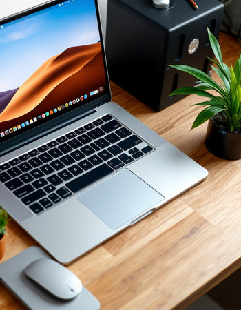Close up of a laptop on a wooden desk with a computer mouse and a plant