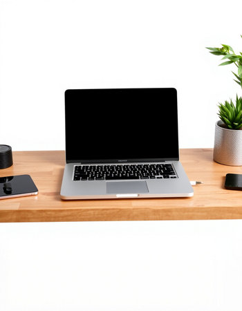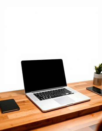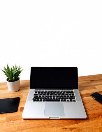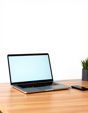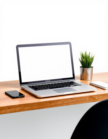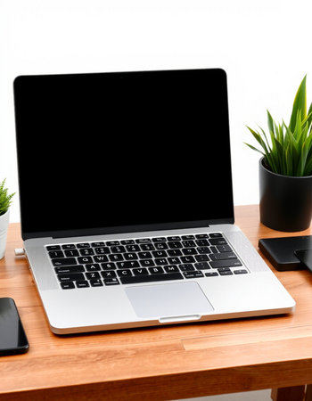 Laptop with blank screen on wooden table with smartphone and plant on white background