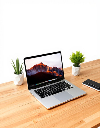 Laptop on wooden desk with mountain view and office accessories on white background