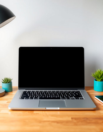 Laptop with blank screen on wooden desk with black lamp and plant
