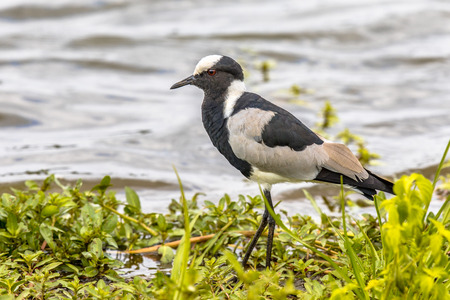 Blacksmith lapwing (Vanellus armatus) walking in green vegetation on bank of waterhole in african savanna in Kruger national park South Africa