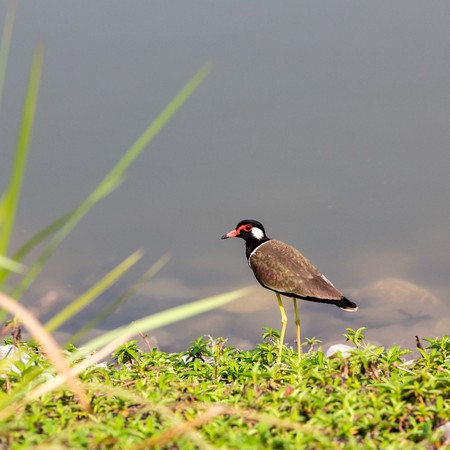 Red-wattled Lapwing bird sitting at the water edge
