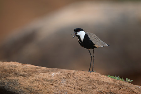 Mono spur-winged lapwing opens beak on rock