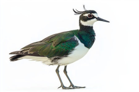 northern lapwing stands elegantly on the ground, displaying its striking green and black feathers, perfect for breeding season. The bird exudes natural beauty in isolation.