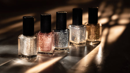 A stunning display of glitter nail polishes arranged artfully on a reflective surface, illuminated by soft lighting that brings out their vibrant tones.