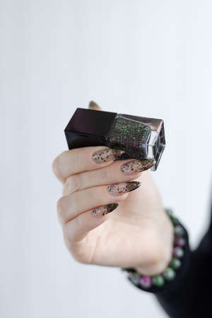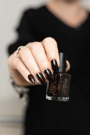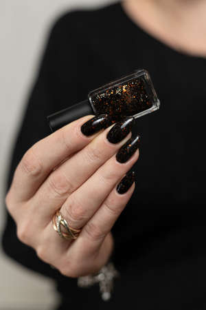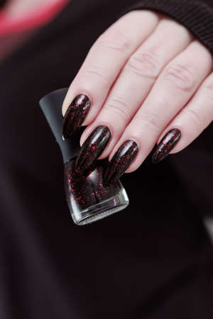 Female hand with long nails and black manicure holds a bottle of nail polish