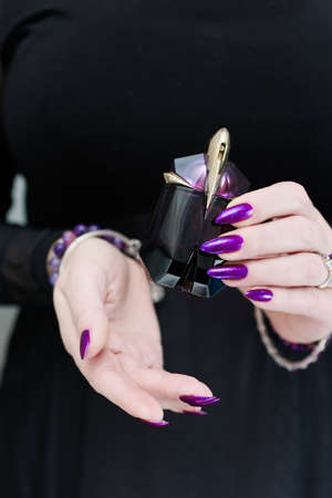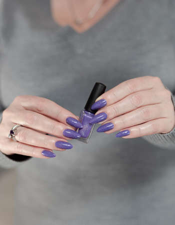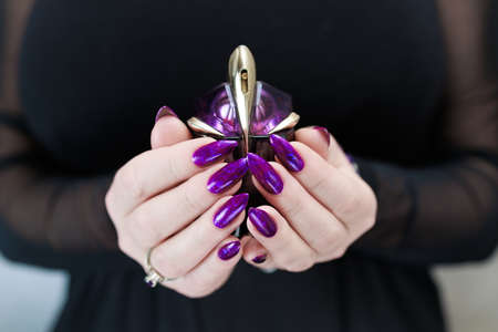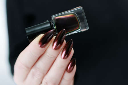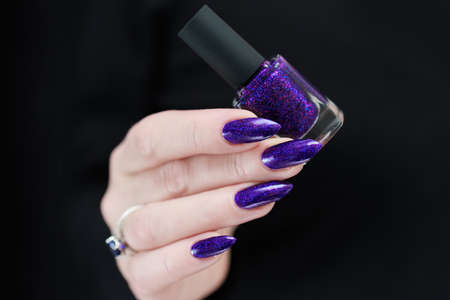 Female hand with long nails and purple plum manicure holds a bottle of nail polish