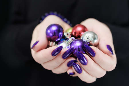 Female hands with long nails and bright purple and blue manicure hold a gift box and Christmas balls. Congratulations to the New Year and Christmas.