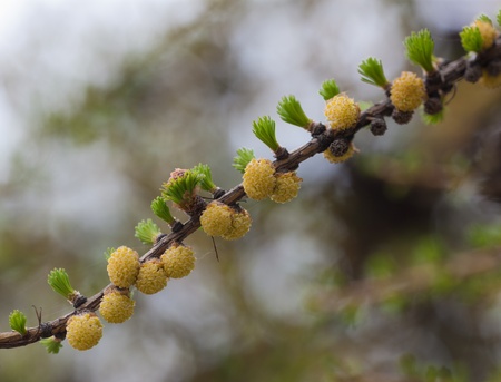 Ovulate cones (strobiles) of larch tree, spring, beginning of May