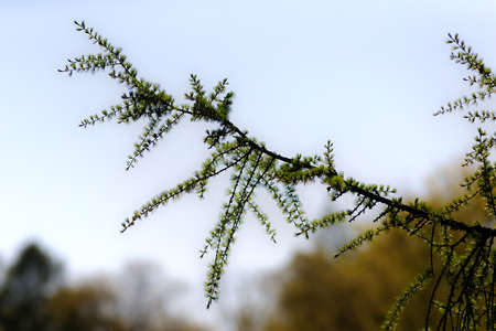 Branches with delicate green young larch needles, narrow focus area, early spring