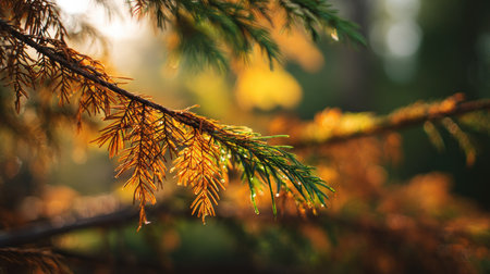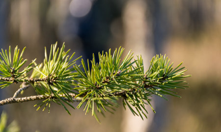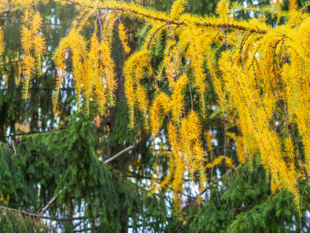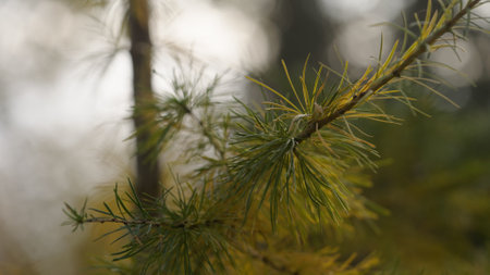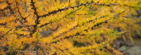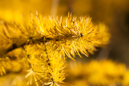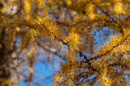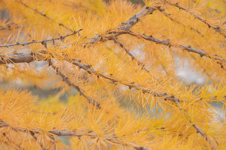 Macro view of a larch tree branch and needles of a yellow color late in autumn. Larch has a spiritual meaning of protection and anti-theft.