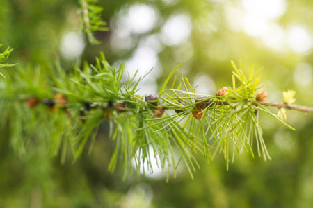 Close-up of green larch tree branch, beautiful spring nature background. Selective focus.