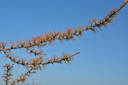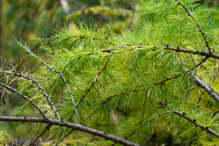 Bright fluffy branches of larix tree. Autumn sunny photo of larch tree. Fall sunny day.