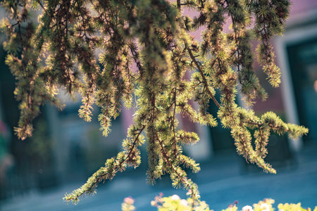 Close up of larch branches hanging downward, illuminated by sunlight, with a blurred background suggesting an urban setting in rovigo, italy