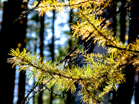 Yellow branch of wild larch is illuminated by the sun, autumn nature, background.