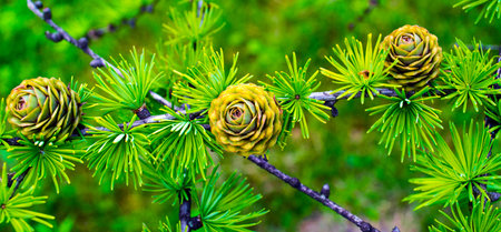 A close-up shot of a larch tree branch showcasing vibrant green needles and clusters of developing, light-green cones against a blurred autumnal background.