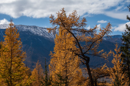 Mountain autumn landscape with colorful larch trees and blue sky.