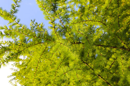 Fresh green branches of larch lit by the sunlight against the blue sky