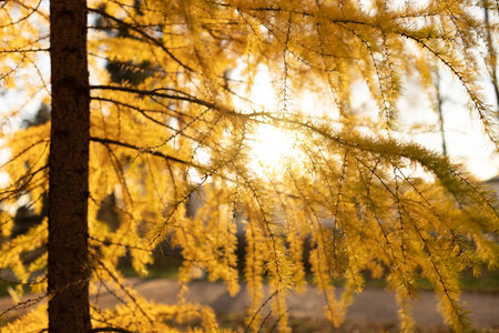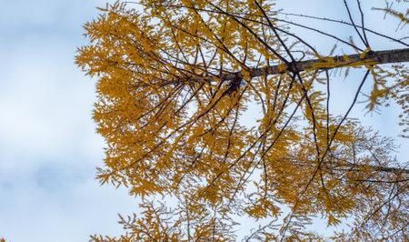 larch tree in autumn, yellowed needles on larch branches during leaf fall season, deciduous conifer