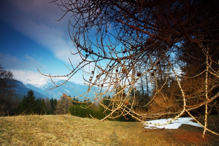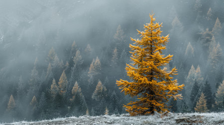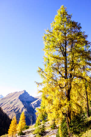 Beautiful yellow larch tree in the mountains. Dramatic scene.