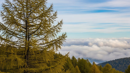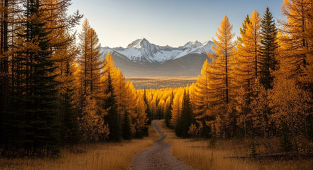 Autumn forest scene with golden larches rugged mountains and clear sky evokes calm nature and seasonal change