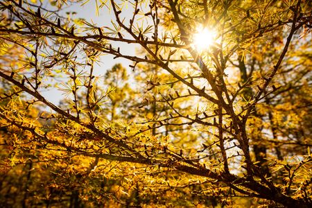 Autumn yellow and red trees against the blue sky. concept of warm yellow autumn without rain