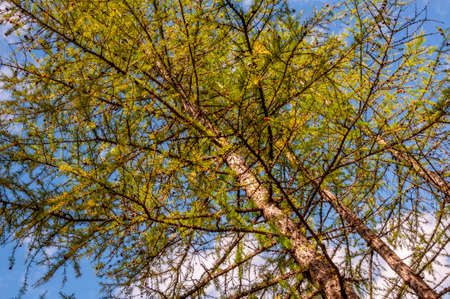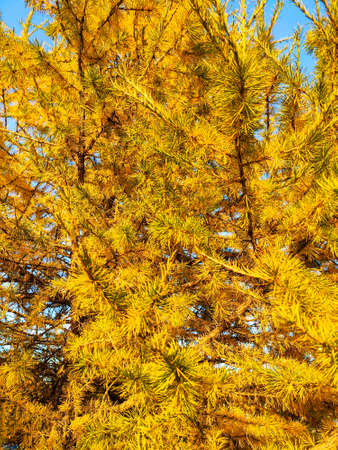 Close-up bright yellow needles on the branches of a larch tree in the park.