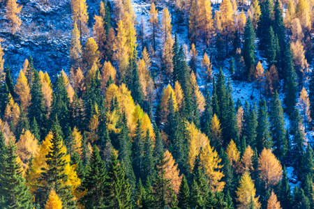 Beautiful autumn alpine landscape with yellow larch trees in Dolomites mountains, Italy