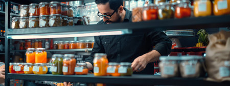 A man with glasses and a beard organizing jars of preserves on a shelf in a grocery store, focusing on the careful arrangement and attention to detail in a retail environment.