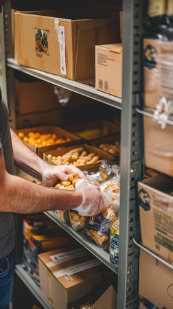 Man placing groceries in labeled glass jars in an organized pantry, promoting food storage and kitchen organization