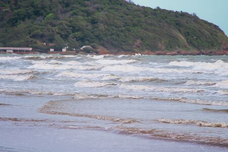 Landscape sea with many waves breaking on sandy shore in the evening