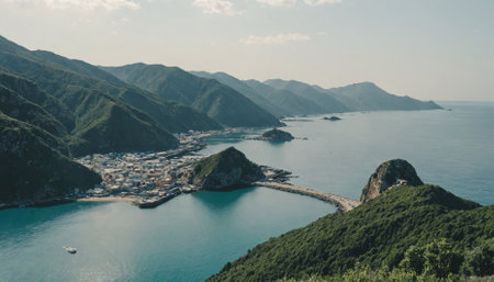 A scenic view of a small town nestled between mountains and a bay
