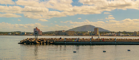 Breakwater with people around in the small trading port of Howth, fishing village near Dublin, Ireland