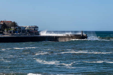 Azores, Big waves crashing over black volcanic rock on the Atlantic Ocean in the coast of Sao Miguel island in the Azores, Portugal