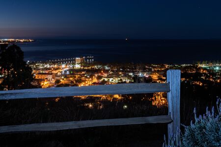 Lights of coastal city of Ventura viewed through the wooden grains of the fence as dawn begins to break in the sky.
