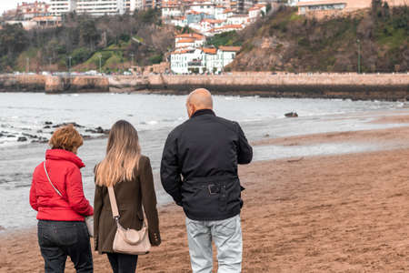 Family made up of mother, father and teenage daughter walking along the beach