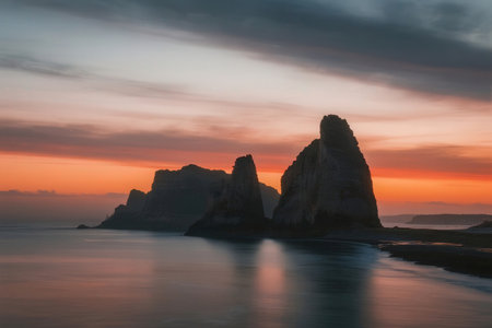 Mist envelops towering coastal cliffs alongside a pristine sandy beach, merging seamlessly with the turquoise waters. the rugged terrain contrasts beautifully with the serene ocean, creating a captivating natural landscape. Generative AI